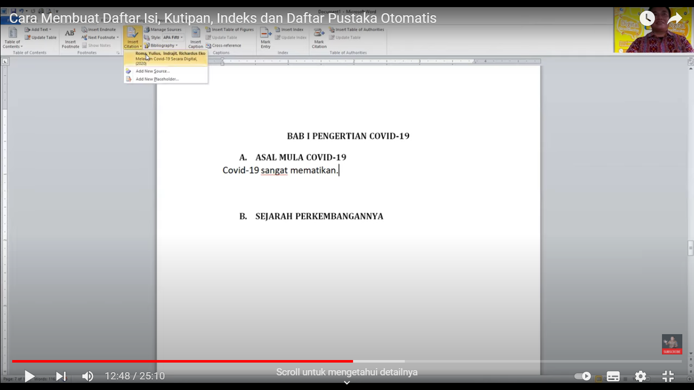 Jika ingin menampilkan kutipan, taruh kursor di akhir kata dari kalimat yang dikutip, pada toolbar References klik insert citation, pilih buku yang dijadikan kutipan.4. Membuat daftar pustaka otomatis.